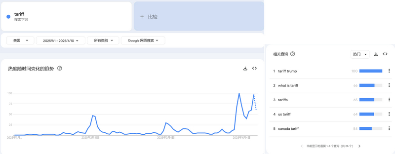 然后来到4月,相信大家也都很熟悉了,中美之间的贸易战迅速激化,在短短一周内,相关数字就从20%上升到了104%。到4月11日,此前已经有20%、在算上本轮加征125%,美国对中国关税已经飙升到145%。