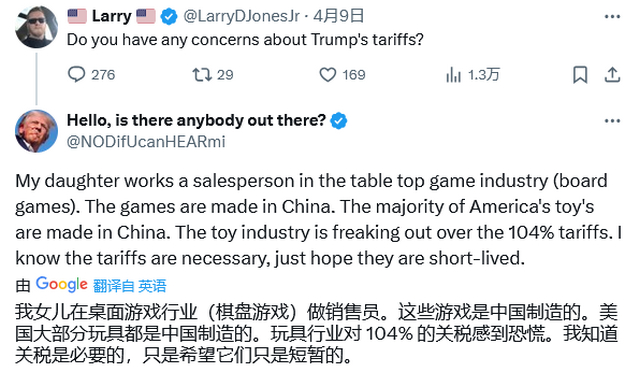 “我女儿在桌面游戏行业(桌游)做销售员。这些游戏是中国制造的。美国大部分玩具都是中国制造的。玩具行业对104%的关税感到恐慌。我知道关税是必要的,只是希望它们只是短命的。”