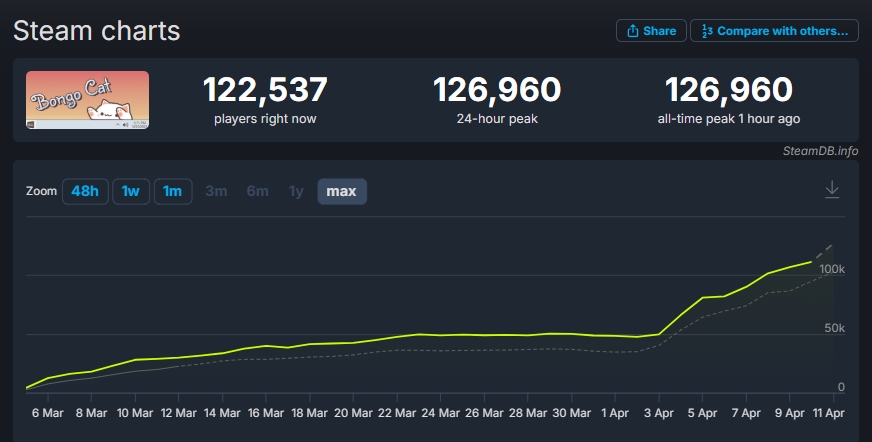 这款游戏、或叫软件也可,就是Steam平台近期超级爆火的《Bongo Cat》。SteamDB数据显示,上线一个多月的时间里,《Bongo Cat》的同时在线人数不断上涨,这两天直冲到了12万,人气甚至压过了《使命召唤》《三角洲行动》等超级大作。
