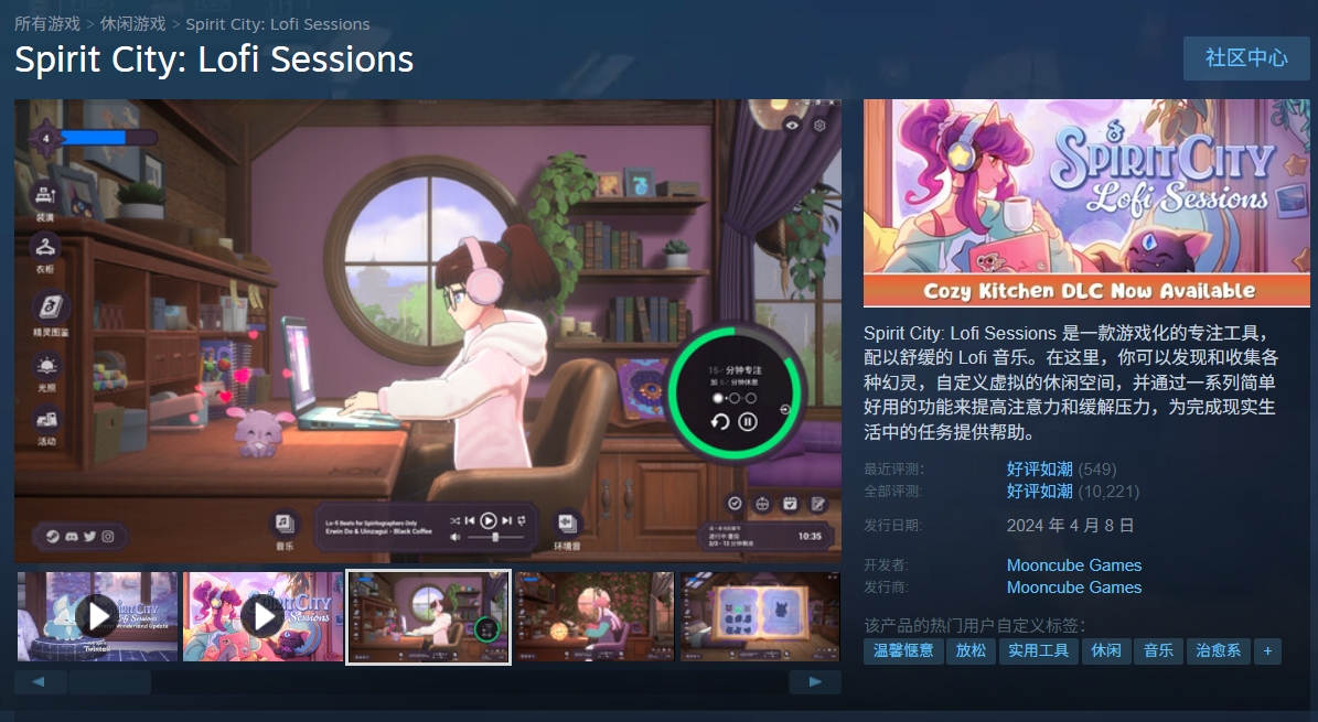 还有一类产品则结合了番茄钟等效率管理工具和了YouTube上主打专注学习的Lo-fi Girl频道的形式,为玩家打造工作学习时的专注助手,也取得了相当不错的成绩。其中的代表产品包括获得10000条评价的《Spirit City: Lofi Sessions》、3000评价的《心流小筑》以及近期即将带着大量愿望单上线的《gogh: Focus with Your Avatar》等等。