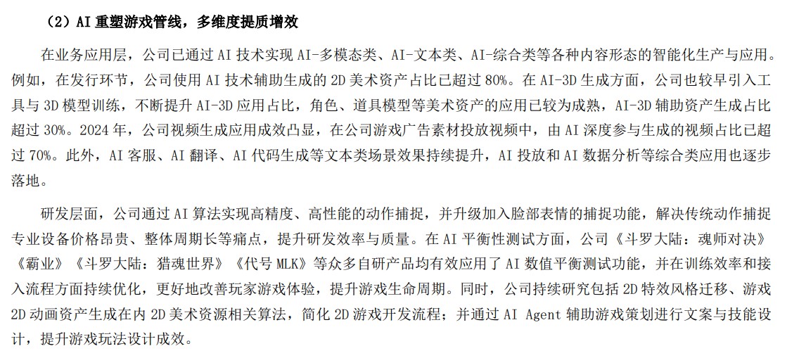 其中,年报中关于AI应用的表述尤为引人关注:当前AI技术已经重塑三七互娱游戏管线,其中在发行环节,使用AI技术辅助生成的2D美术资产占比已超过80%、AI-3D辅助资产生成占比也已超过30%。在客服、翻译、代码等文本类场景中,AI效能持续提升,并逐步在投放和数据分析等领域实现落地。
