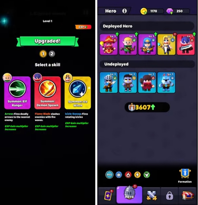 塔防肉鸽部分,该游戏通过章节式关卡供玩家单机体验。每个关卡中,你可以选择两个技能或者说两个英雄。在战斗开始的时候,玩家并没有英雄可用,只有选择英雄的技能之后才能得到它,比如第一轮战斗的时候,战场上只有2个英雄,通过选择不同英雄的技能,你还可以获得新英雄。只不过,上阵英雄是有限制的,每一队最多5个英雄。