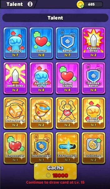 除了关卡、星级挑战和活动等内容外,该游戏还增加了非常丰富的进度系统。除了角色的升级、升星和装备之外,另一个比较重要的进度系统是天赋,玩家可以在通关17章之后解锁,每次获得的天赋都是随机的,同样的天赋可以用来升级(需要不同数量的金币)。如果有充足的金币,意味着你能够得到尽可能多的天赋,把它们升到最高级。