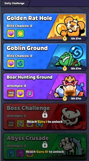 运营方面,《胡闹地牢》还提供了5个日常挑战,但需要玩家达到特定关卡之后才能解锁全部。基本而言,这些挑战是玩家日常获得金币、钻石、装备等游戏资源的地方。