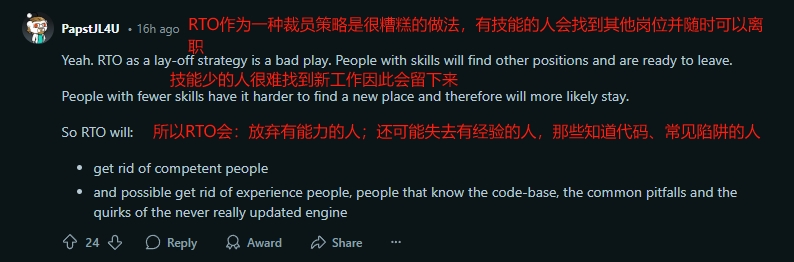 甚至,有同行表示,这其实是一种裁员策略。开发者habsfan51说,“我很多朋友仍在老家的游戏行业工作,他们都跟我说这是一种裁员策略:企业借此裁掉那些远程办公(来自其他城市或国家)的员工,因为这些人通常负担不起每周多次前往办公室的费用(尤其是他们住得离办公室很远的话)。说真的,这很让人难过,因为工作室正因强制返岗政策失去资深员工,而这些空缺被初级员工填补。这就给留下来的资深员工和中级员工带来了额外压力,他们不得不更加努力地工作以适应和调整。”