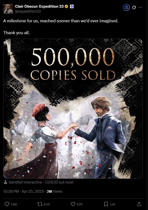 最近,又一款小团队制作的高品质游戏取得了令人惊讶的成绩。当地时间4月24日,由Sandfall Interactive研发、Kepler Interactive发行的回合制RPG游戏《光与影:33号远征队(Claire Obscur:Expedition 33),以下简称 33号远征队》上线首日销量就突破了50万套,且目前Steam平台峰值同时在线人数已达到12万人,用户好评率更是达到93%。