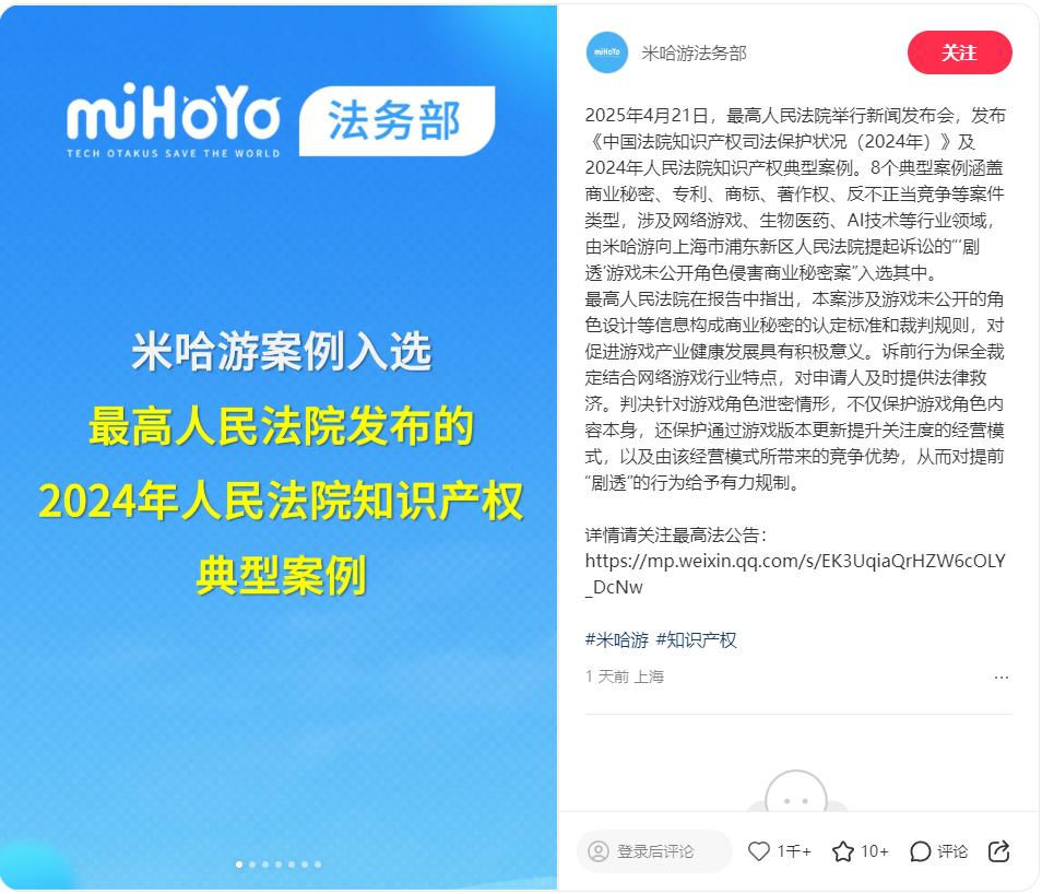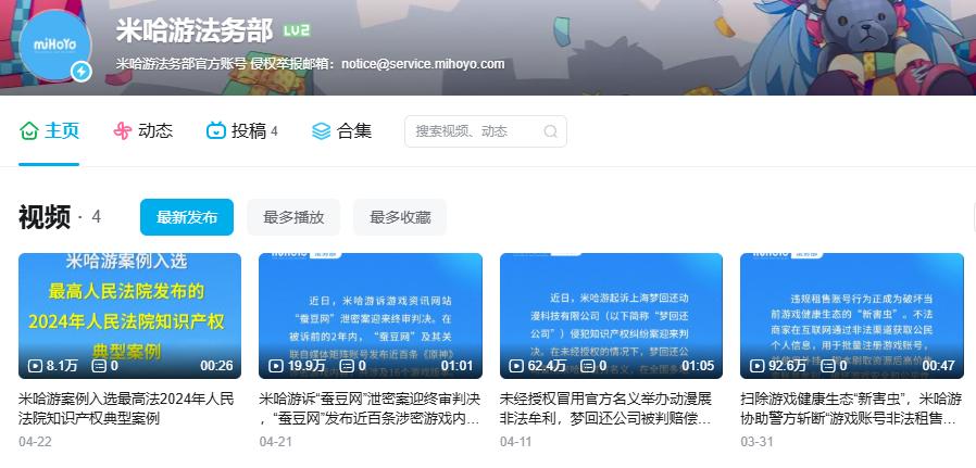 这相当于代替米哈游向外界宣传他们维权行为的成功,扩大影响力、震慑不法行为,成果也受到了多数玩家和网民的认可。不仅如此,从账号的最新投稿看,米哈游打击“内鬼”的维权案例还入选“2024年人民法院知识产权案例典型”,得到了官方背书支持。