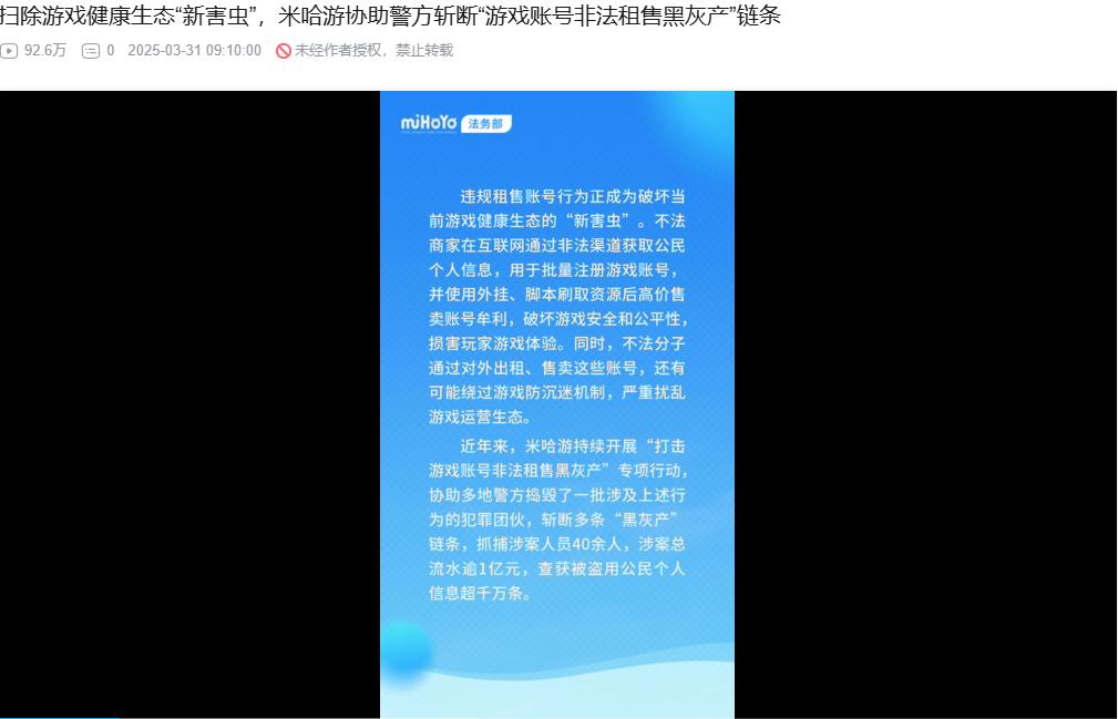 也许是考虑到该账号的严肃性,“米哈游法务部”关闭了各大平台的评论区,但其播放量和阅读量表现普遍不错。以B站为例,单个视频播放量高达92万,对于一个仅14万粉丝的账号而言,这个数据可以说是相当突出。