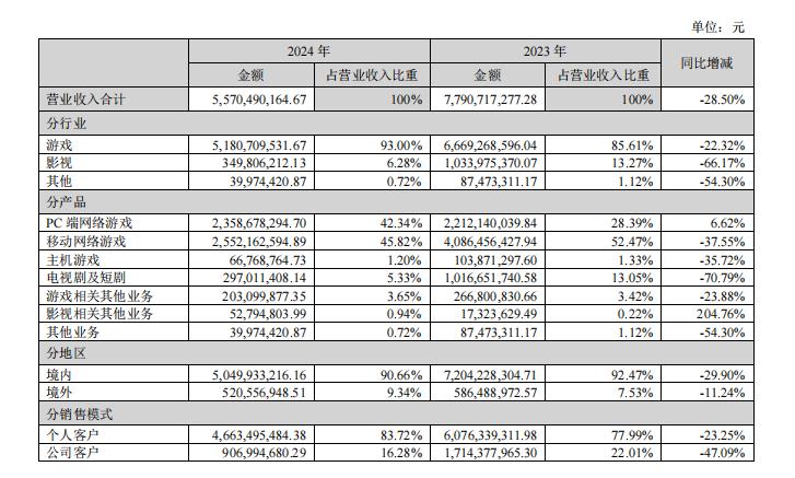 按行业来看,影视业务不达预期,出现了高达66.17%的下滑,但业务占比仅6.28%;占比93%的游戏业务去年营收51.81亿,也出现了22.32%的同比减幅。若分地区来看,占比超九成的国内市场同比减幅严重,下滑29.9%。