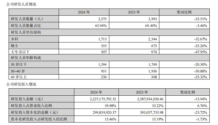 报告期末,研发人员数量为2575人,同比减少 35.51%。其中,30 岁以下研发人员占比由 44%提高至 54%,本科及以上学历研发人员占比由 76%提高至 80%,以更好地匹配公司未来业务发展的需要。