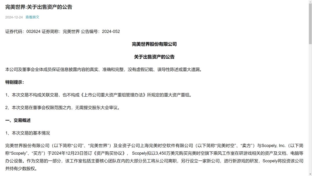 据Scopely官方说法,光2024一年,他们就和超过800家公司就投资收购进行了面谈。完美世界及全资子公司上海完美时空,正是在2024年12月23日与Scopely签订《资产购买协议》。根据协议,作为交易的一部分,该工作室包括主要核心团队在内的大部分员工将从公司离职,另行设立一家新公司,进行新游戏的研发,Scopely将投资该公司并持有少数股权。