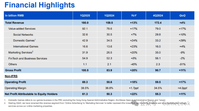 游戏新闻报道/5月14日消息,今日腾讯公司发布了2025年第一季度财报。财报显示,腾讯一季度总收入为人民币 1800 亿元同比增长 13%。期内本公司权益持有人应占盈利为人民币 613 亿元,同比增长 22%。资本开支为人民币 275 亿元,同比增加 91%。