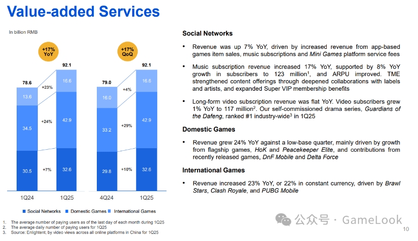 腾讯增值服务业务2025年第一季的收入同比增长 17%至人民币 921 亿元。