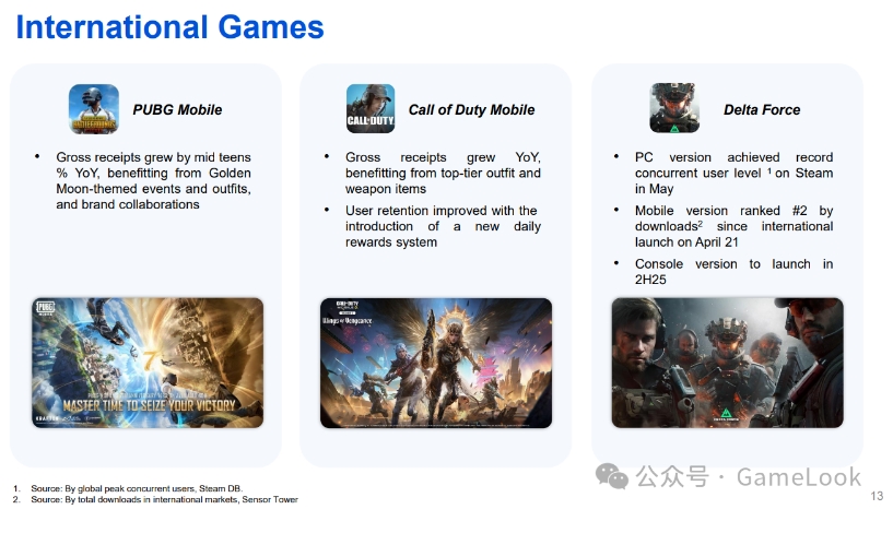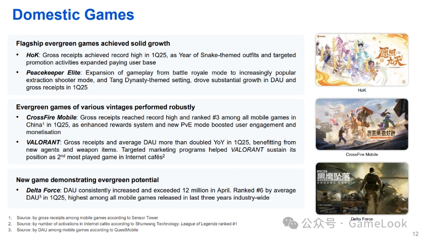 多款长青游戏包括《王者荣耀》和《穿越火线手游》,于游戏传统旺季的第一季,流水创下历史新高。《三角洲行动》的本土用户数自上线以来达到新高,日活跃账户数峰值于2025年4月突破 1200 万。按平均日活跃账户数计,《三角洲行动》在行业最受欢迎手游中排名第六,并成为行业近三年发布的新游戏中平均日活跃账户数最高的游戏。