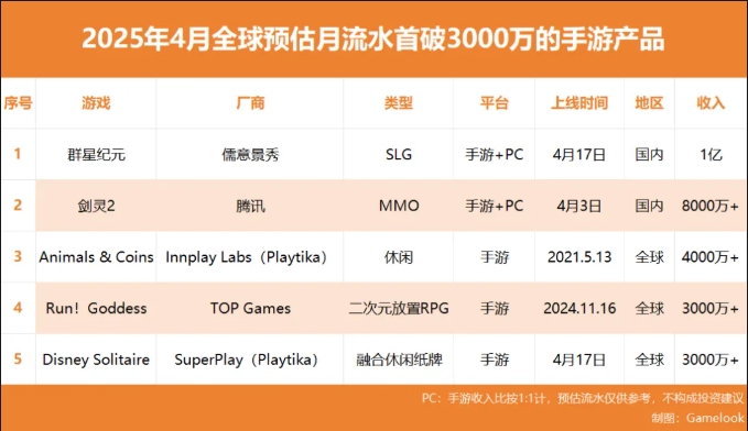 游戏新闻综合多个三方平台数据统计发现,2025年4月共有5款游戏预估月流水首次突破3000万元,其中有3款是4月份发布的新游,另外两款则是在月流水首次突破3000万元的产品。