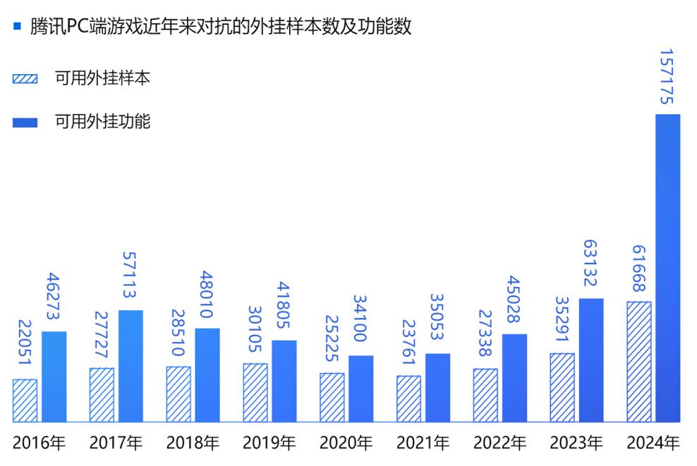 2024年,腾讯PC游戏外挂保持着高位激烈对抗态势,腾讯PC游戏的外挂对抗的外挂样本数和功能数出现明显增长,2024年检测到的外挂样本达到61668款,同比2023年的35291款增长74%。而外挂功能数达到了157175款,同比2023年的63132款增长149%。