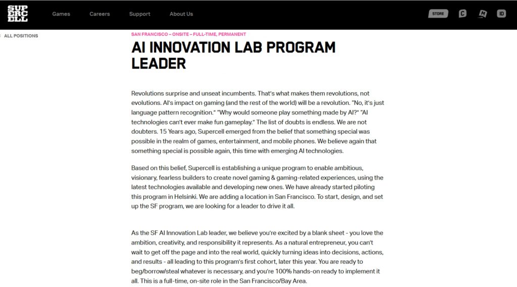 随着AI技术的发展和流行,Supercell也在尝试,并且于近期增加了对应岗位,其描述是: