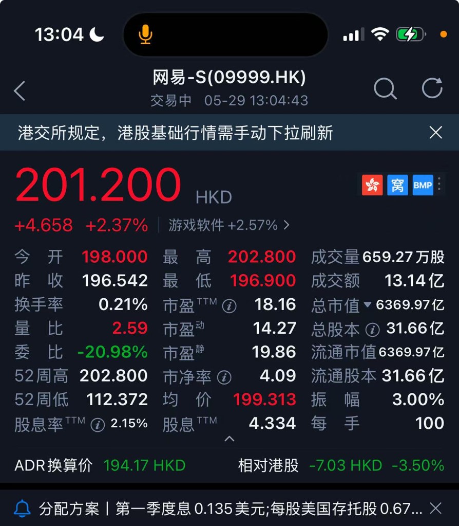 网易港股股息率为4.334%