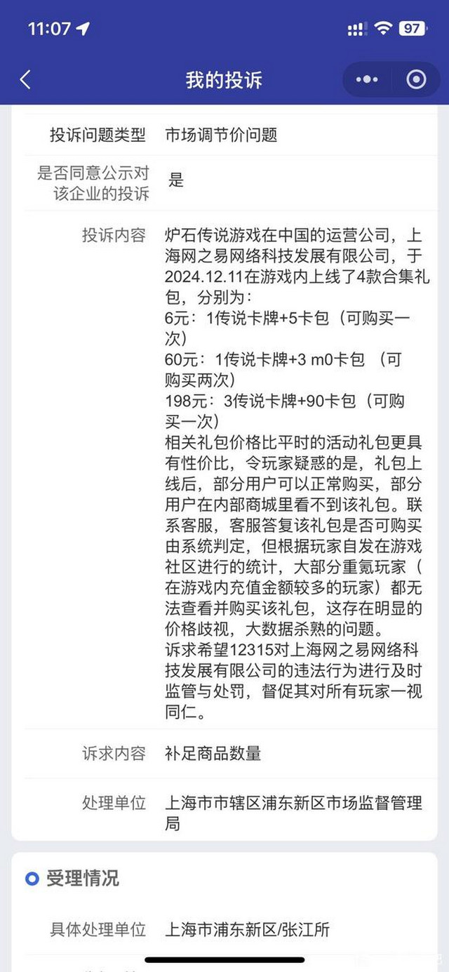 而随着社区舆论虽然发酵,便开始有网友怀疑是《炉石传说》官方在“大数据杀熟”,随后便以“市场调节价”为由,将上海网之易投诉到了上海市浦东新区市场监管局。