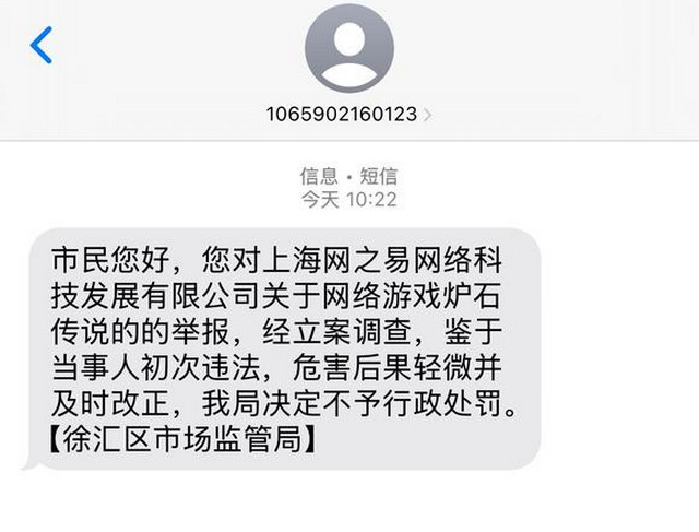 近期,部分投诉玩家收到监管部门回执,确认调查结论:“您对上海网之易网络科技发展有限公司关于网络游戏炉石传说的举报,经立案调查,鉴于当事人初次违法,危害后果轻微并及时改正,我局决定不予行政处罚”。