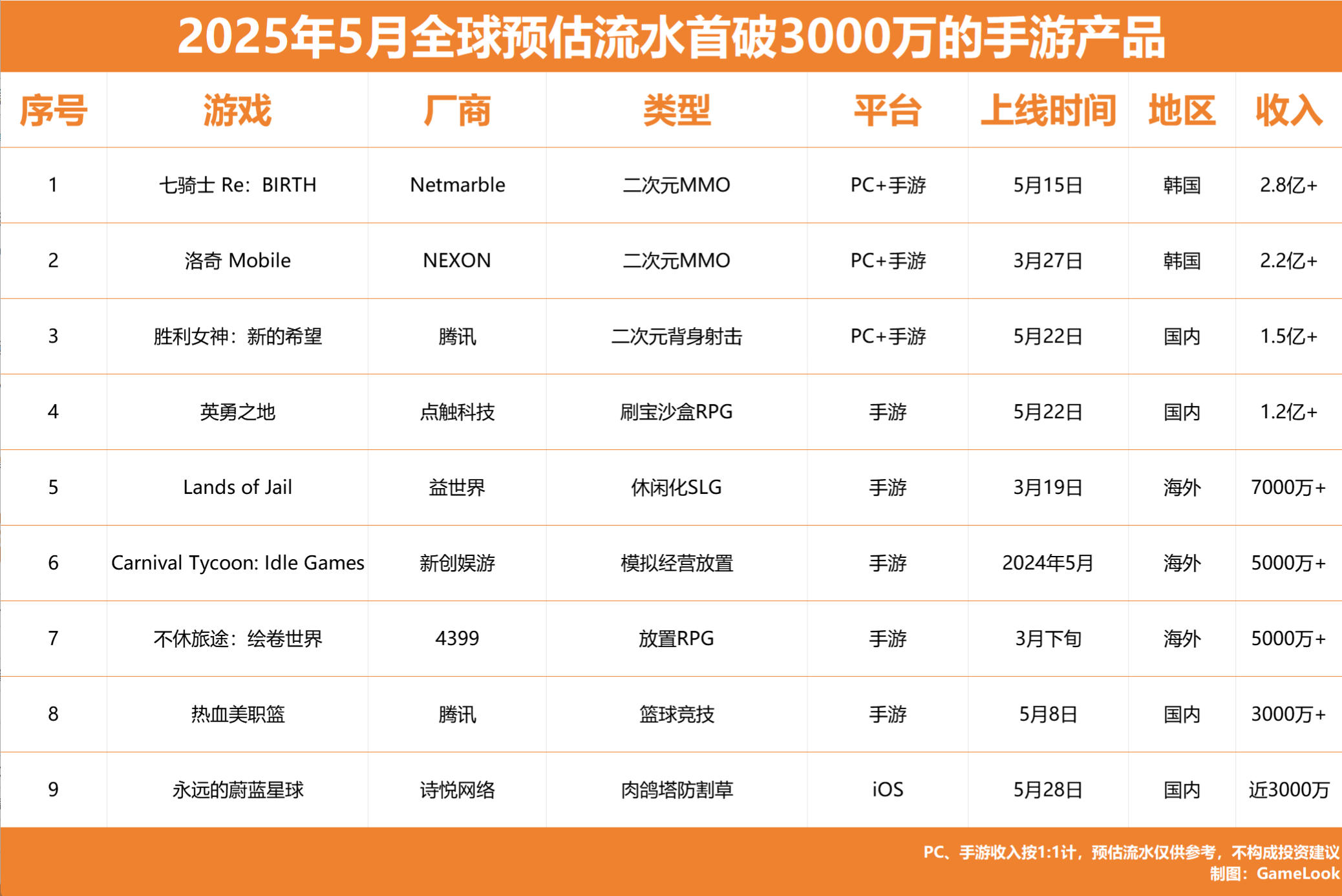游戏新闻综合多个三方平台数据统计发现,2025年5月共有9款游戏预估月流水首次突破3000万元。其中有5款是5月发布的新游,另外4款则是在月流水首次突破3000万元的产品。