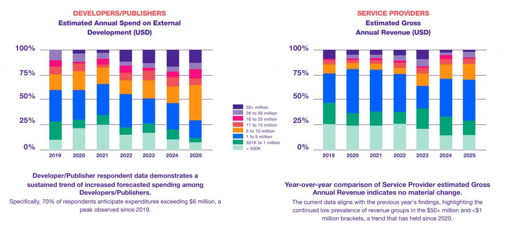 开发者与发行商的双面叙事:一方是始终乐观从容的从业者,另一方则是日益焦虑的服务供应商。值得注意的是,发行商已预见到2025年,对外包服务需求将出现下滑。
