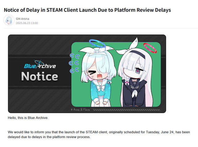 《蔚蓝档案》原定于2025年6月24日推出其Steam版本,该版本为国际服且锁国区。然而,NEXON在上线前夕突然公告,由于Steam平台的审查流程出现延误,游戏无法如期上架。官方承诺将与Steam积极合作,争取在最短时间内完成审核并公布新的上线日期。