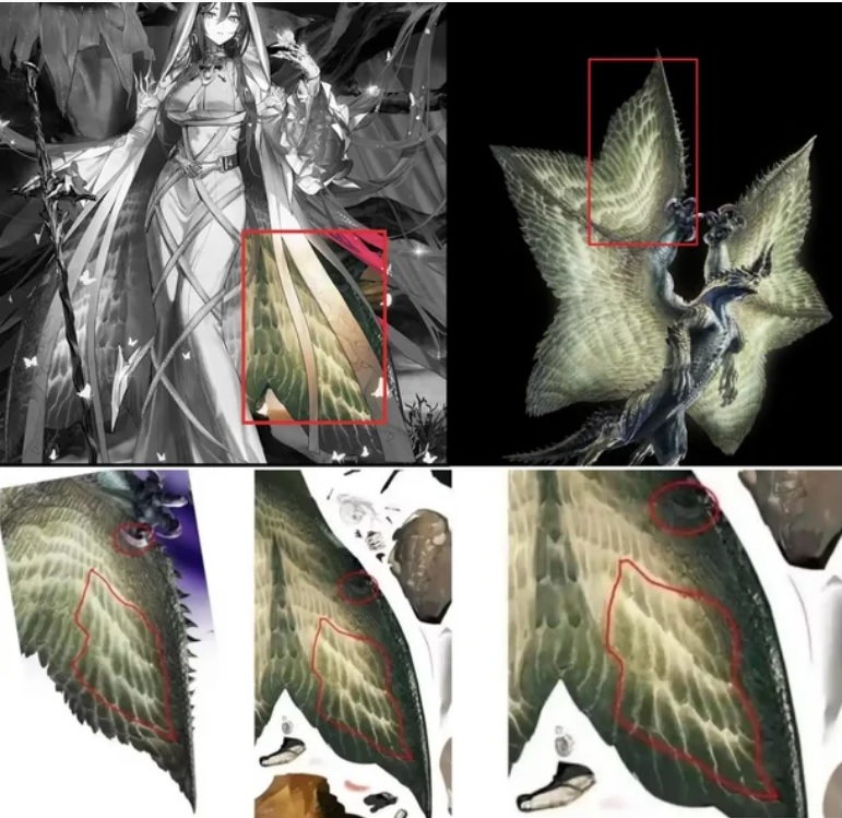 当时《明日方舟》新版本上线后,玩家发现角色“阿斯卡纶”的新皮肤设计涉嫌直接挪用卡普空《怪物猎人》中“天廻龙”的翅膀纹理。网友对比图显示,二者在色彩、结构及细节上高度相似,当时便在社区内引发了不小的争论。