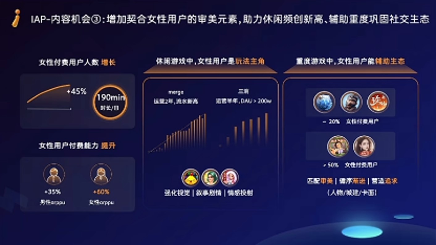 接下来和大家聊聊第三个视角,即今年我们观察到的生态中驱动增长的关键群体——女性用户。这两年,女性付费用户人数增速达到了45%。她们在游戏中的投入度很高,单日可达三小时以上,并且付费能力增速比男性用户更高。这些数据表明,女性用户不再仅仅是快乐玩家,也越来越多地扮演着内容生态共建者的角色。