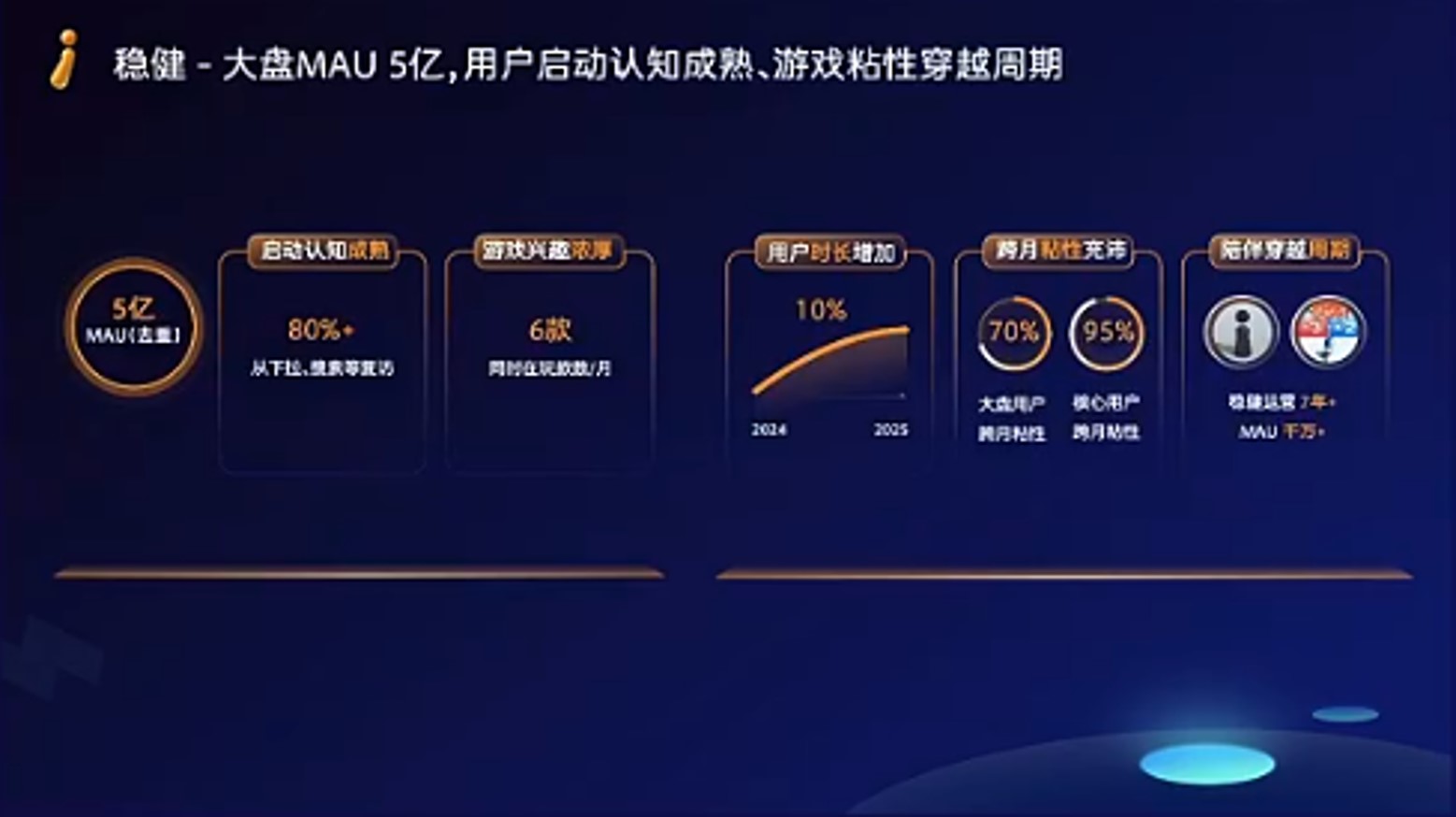 80%以上的人日常会通过主动搜索下拉或社交渠道主动启动游戏,这也意味着用户对游戏的启动认知和复访认知已经充分成熟。与此同时,在如此一个庞大体量下,我们发现用户对游戏的沉浸度和体验度依然在不断强化,年对年游戏时长增长10%。今天我们也分享一些新视角的数据,可以看到用户的跨越粘性可达到70%,核心用户的这一数据指标95%,这意味着每100个玩家中有95个人在下一个月仍会活跃在我们的生态中。可以说大家把小游戏真的变成一种生活方式,变成自己愿意重复驻留的娱乐和生活空间。