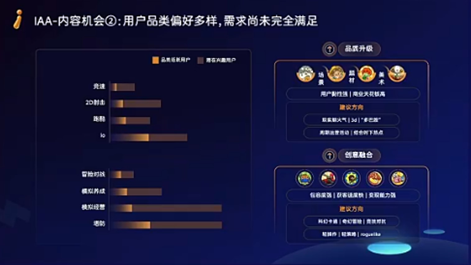 聊完前面这一页,大家可能会问接下来是否只能立项SLG和MMO的项目?其实并非如此。我们可以看到整个IAP大盘的基本面,从不去重的视角来讲,这个用户规模有两亿以上,并且其中有将近三成(25%)的人他们依然在玩那些放置的IAP产品、有60%的人会选择一些更加轻量的休闲IAP游戏,或者是一些纯IAA的玩法。那么这些数据告诉我们,其实对于我们生态基本面的绝大部分用户,他们依然有着更轻、更爽、更新的一些游戏体验的诉求。