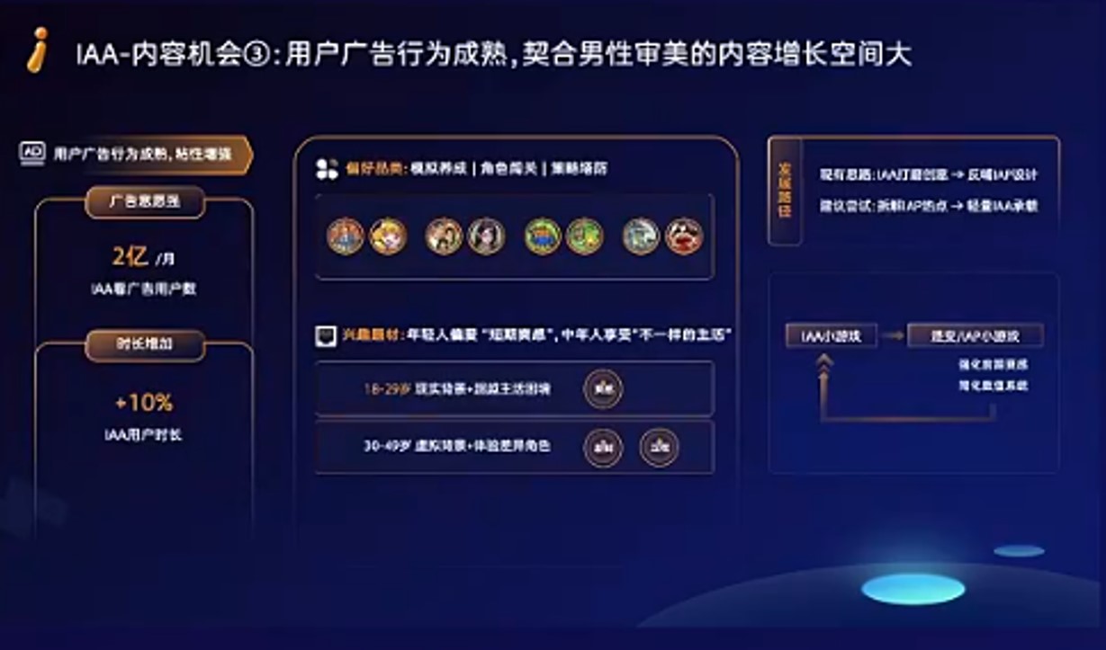 因此随着用户广告行为的成熟,目前整个IAA大盘用户的时长也在持续增加。其次,从男性用户视角来看,他们今年在生态中表现出的广告价值和变现能力非常明显。对于男性用户,建议在后续产品设计上结合更多契合他们审美的元素。