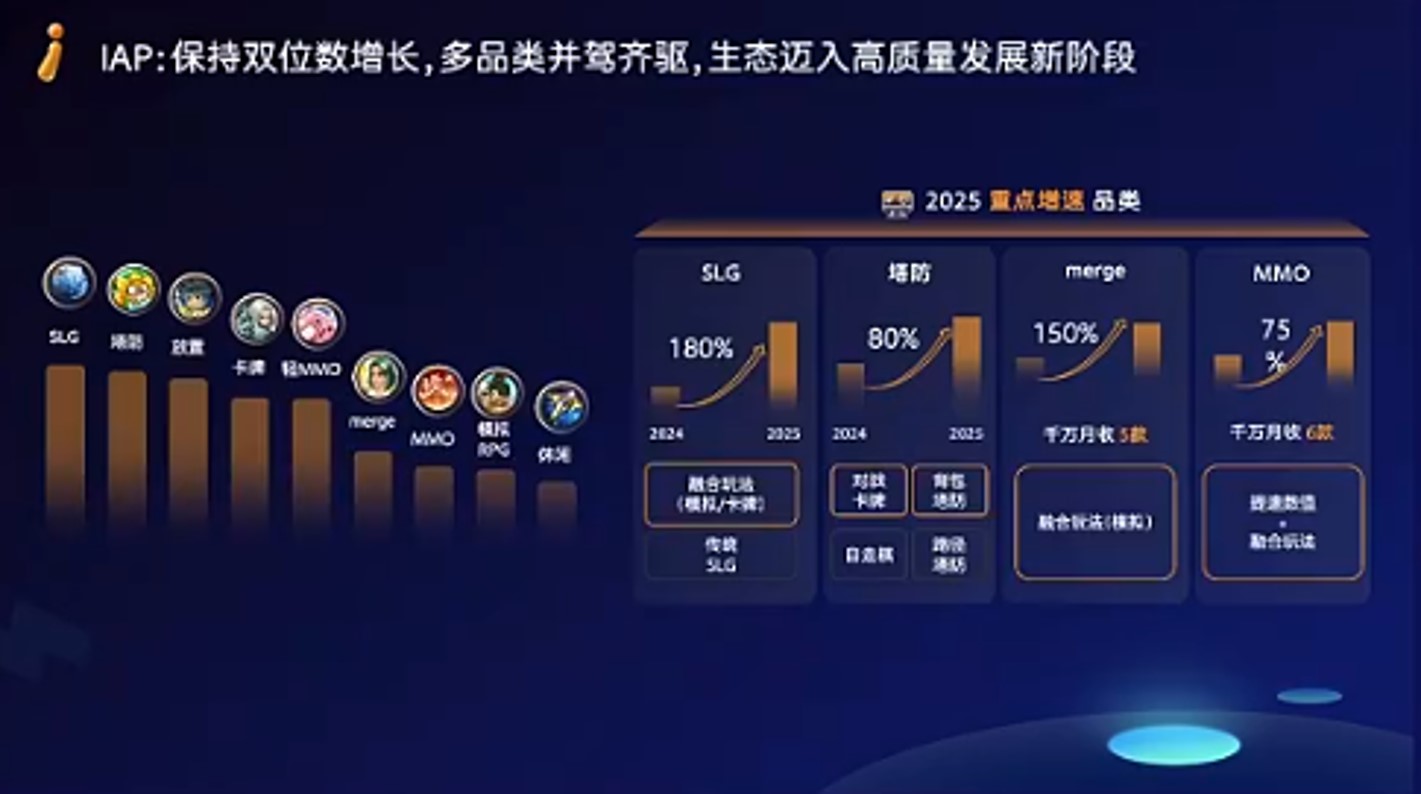 今年整个IAP行业发展稳健且健康,大盘规模保持双位数增长,跑在前面的几个品类营收差距其实非常小。我们也能看到生态过往强势赛道和新兴玩法并驾齐驱,可以说真正做到了百花齐放和新老共生。过去一年增速最突出的四个品类是SLG、塔防、二合(merge)和MMO。