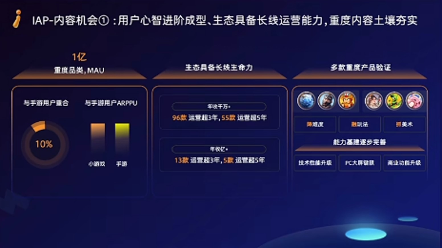 那么对于重度品类的发展,它最核心的基石和命脉是什么?是整个生态的一个成熟度,是不是能够足够撑得起用户的长线和留存,这直接决定着产品的命脉和我们商业天花板。