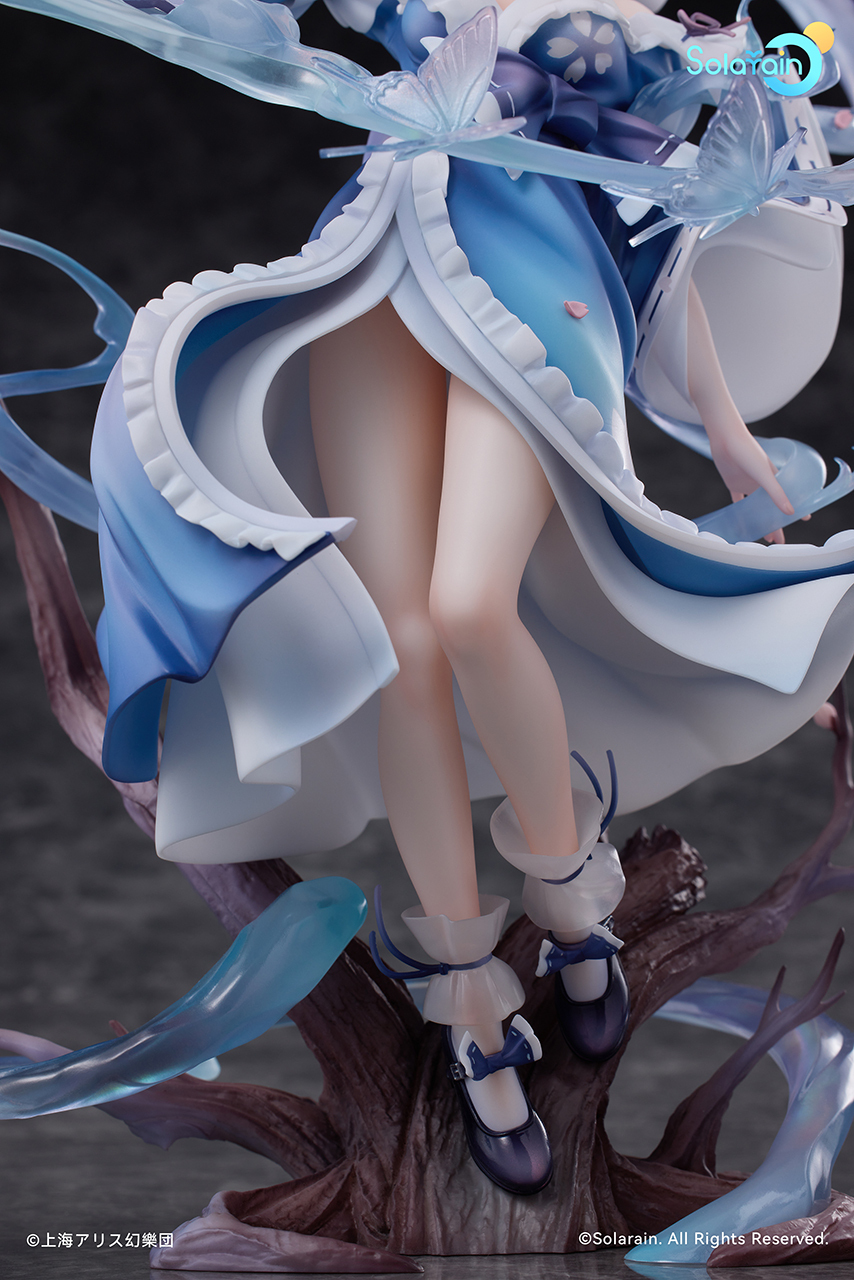 幽幽子身穿标志性的蓝白和服,服饰点缀着樱花纹样,与手办四周散落的樱瓣形成呼应。本套服装略微有别于原作,改为了低胸和服,同时长裙根部增加了性感的开叉,看来即使在冥界也无法避免幻想乡的炎炎夏日XD