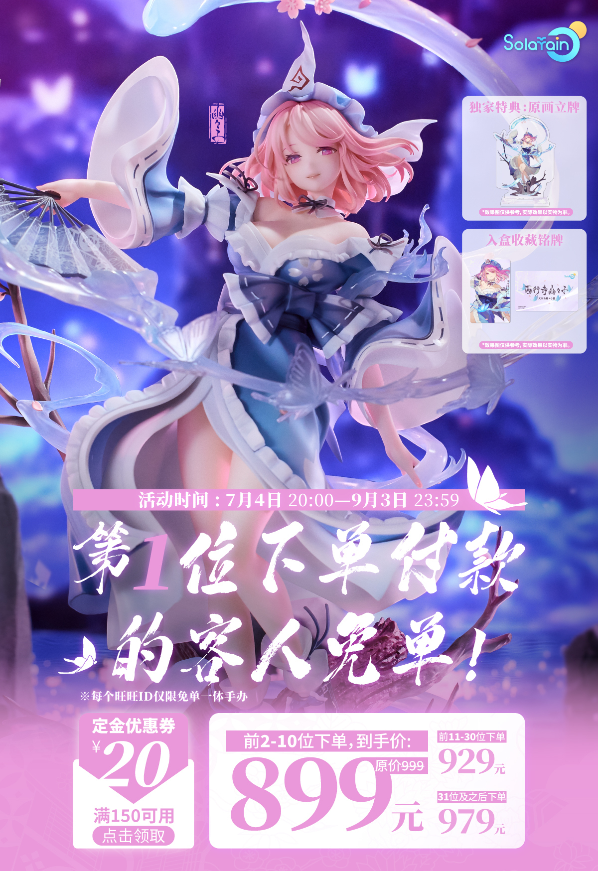该手办将在2025年7月4日晚八点整准时开启预售,在SolarainToys旗舰店购入除了可获得全数封入「西行寺幽幽子」收藏铭牌外,还可获得店铺独家特典:「西行寺幽幽子 天衣无缝的亡灵 Ver.」原画立牌,以及还有首位免单及大额价格优惠等你哦!