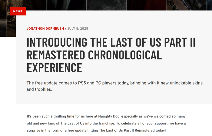 今日,顽皮狗工作室宣布《最后生还者 第二部 复刻版》将推出时间顺序模式(Chronological mode),该模式重新编排了游戏内故事发生的顺序,可让您按时间顺序游玩故事,新更新现已在PS5和PC上正式发布。