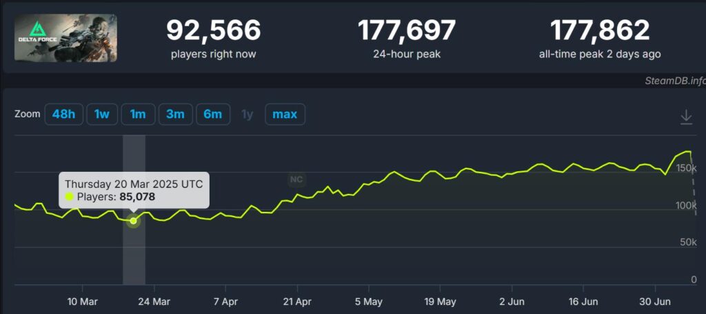 SteamDB数据显示,今年3月底《三角洲行动》Steam在线人数下滑至最低点8.5万左右。主要因为当时正值赛季末,再加上战役模式「黑鹰坠落」带来的新一轮热度逐渐降温——这也是长线运营游戏出现的正常波动。