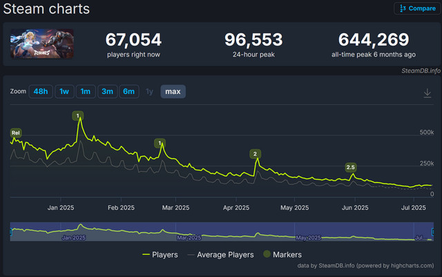从数据层面来看,《漫威争锋》的衰落轨迹清晰可见。SteamDB数据显示,游戏的同时在线人数从1月份的高峰期开始持续下滑:2月份峰值跌至约43万人,3月份进一步下降到约30万人,而到了6月份,CCU峰值为15万人左右。