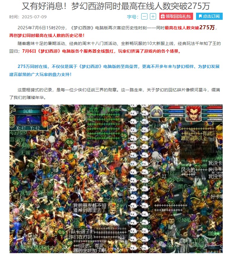 游戏新闻报道/在国内游戏圈,能靠一款“老游戏”引发关注的厂商不多,网易是其中之一。7月6日,《梦幻西游》电脑版迎来了一个标志性时刻:PCU(最高在线人数)首次突破275万,打破2012年创下的271万纪录,也刷新了2023年的272万的在线数据,登顶新高。