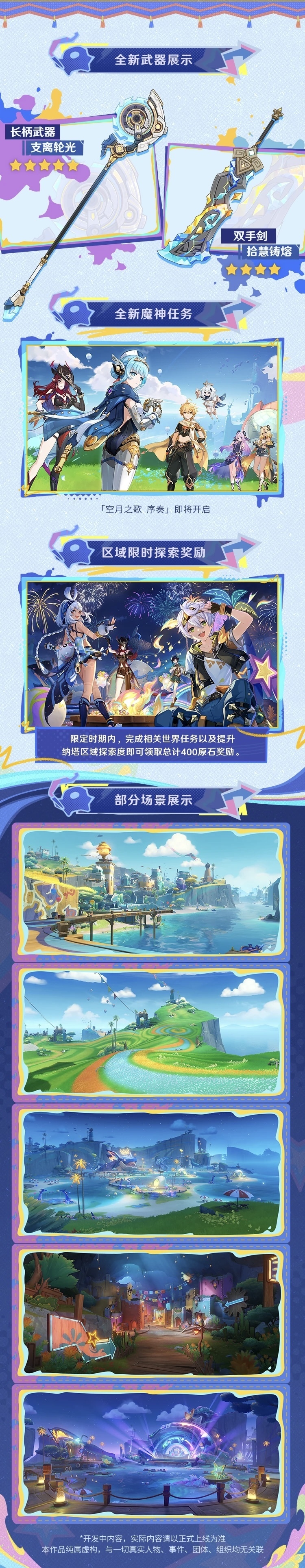 本次版本更新将开启魔神任务新章节「空月之歌·序章:归途」,正式拉开「挪德卡莱」篇章的序幕。玩家将在全新区域初次探索与「烬寂烸」相关的故事。