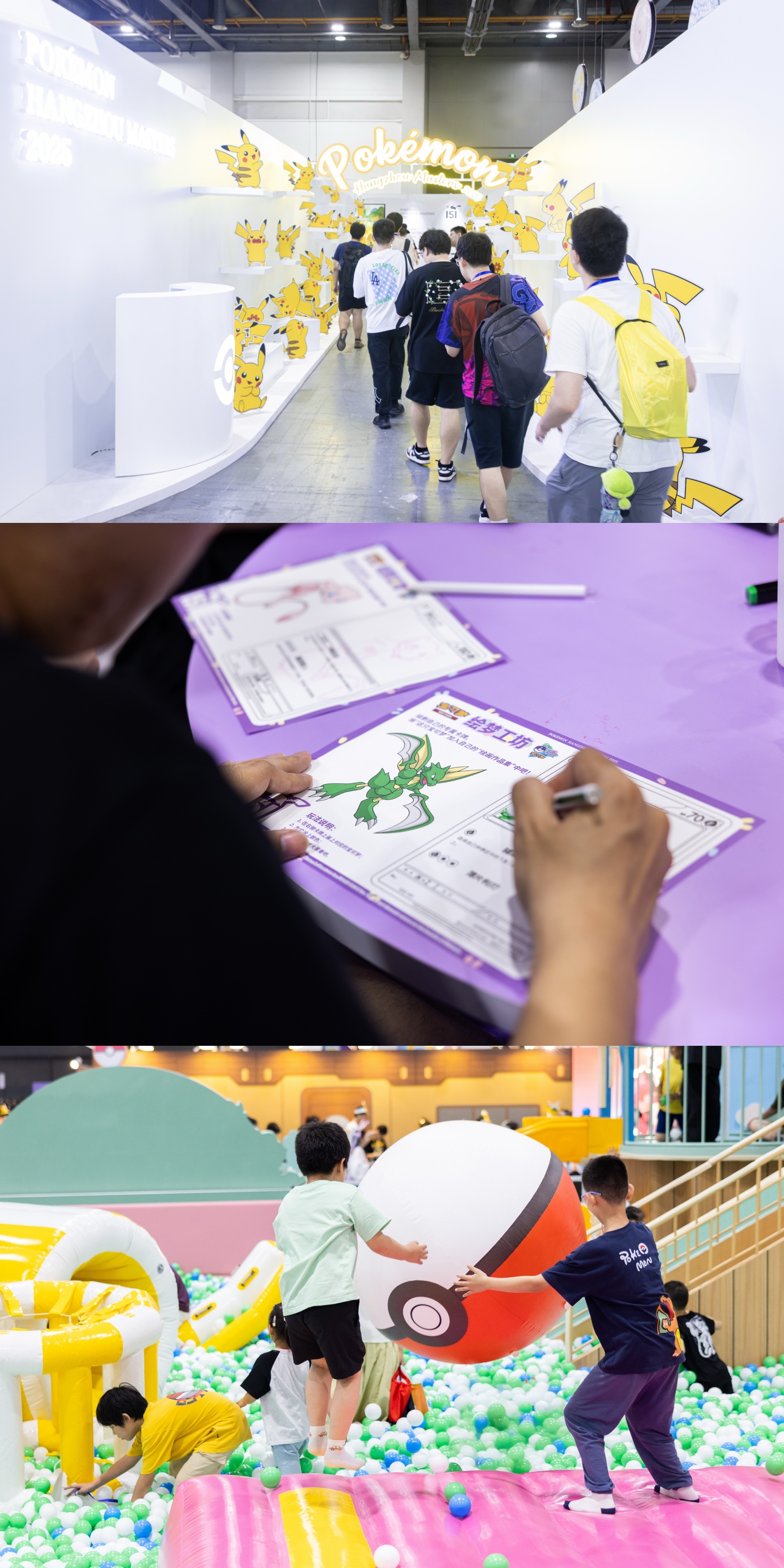 紧张刺激的比赛区域之外,本次大师赛还设有丰富的嘉年华活动以及超大规模的“杭州大师赛购物站”。本次购物站规模为历届大师赛之最,为大家提供了海量宝可梦周边商品以及本次大师赛的特色主题商品。同时,在购物站队列处还特别设置了宝可梦画廊。用户可在排队过程中欣赏宝可梦精美插画,享受更好的购物体验。嘉年华活动也面向暑假期间的亲子家庭特别设置了儿童游乐区域,让小粉丝们也能体验宝可梦的乐趣。不仅如此,现场新增的编发、美甲和脸部贴纸专区也吸引众多训练家热情参与,将他们对宝可梦的喜爱汇聚于造型之中,为夏日注入艺术活力。现场还特别邀请到了宝可梦卡牌插画师,为广大粉丝们带来了更多惊喜。