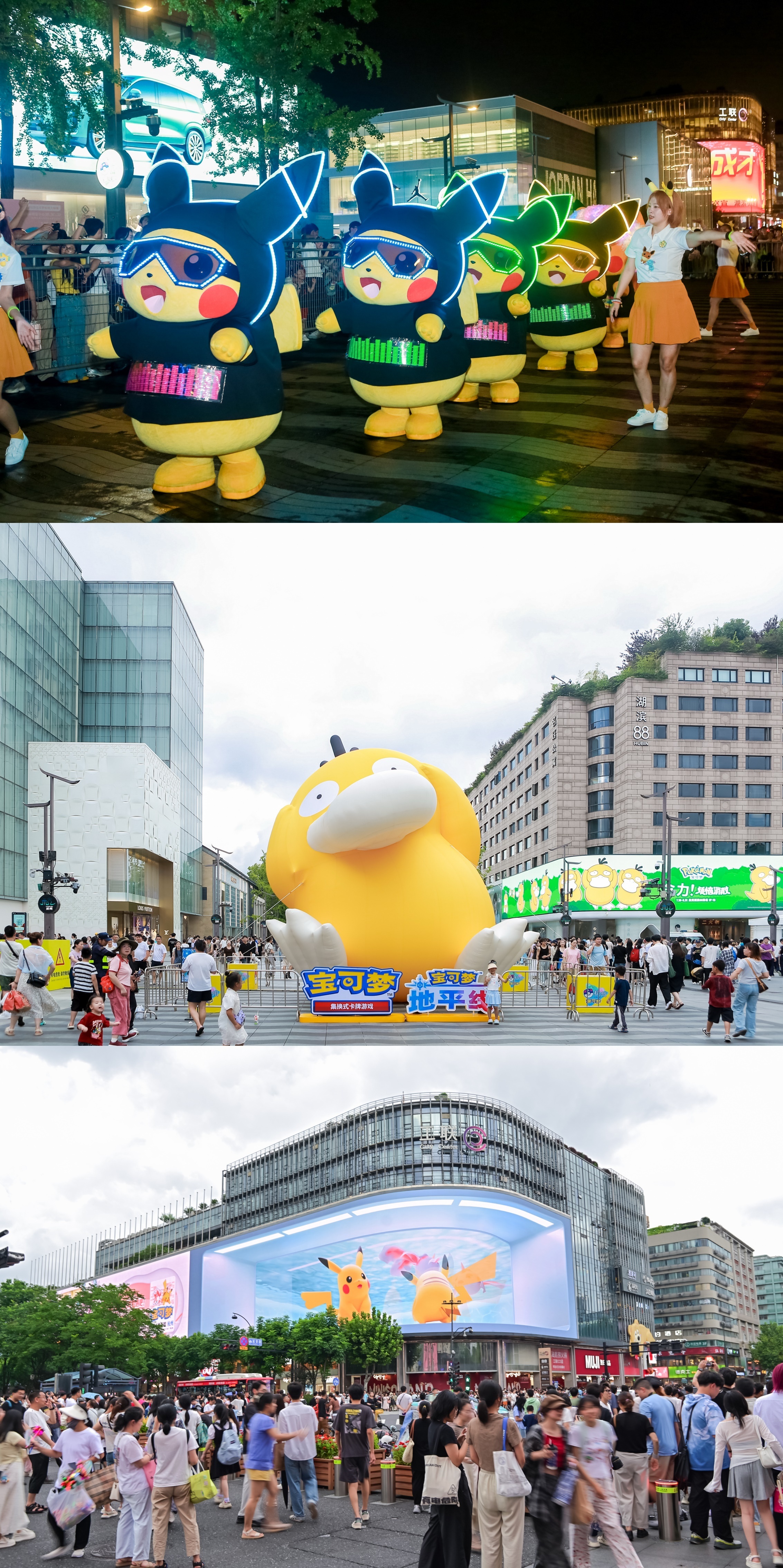 大师赛期间,杭州市内也洋溢着宝可梦的气息。26日晚夜空中闪现的宝可梦无人机表演为城市镌刻下了与宝可梦的美好回忆。而从杭州东站出发的宝可梦涂装公交车也满载游客奔驰在西湖岸边,成为别样风景。7.5米高的可达鸭巨型气模及宝可梦双层快闪店一同吸引众多游客到访,成为新晋热门打卡点。而第三家宝可梦官方卡牌道馆也于7月11日杭州工联CC次元站正式开启,为广大宝可梦粉丝提供了更为广阔多样的体验空间。