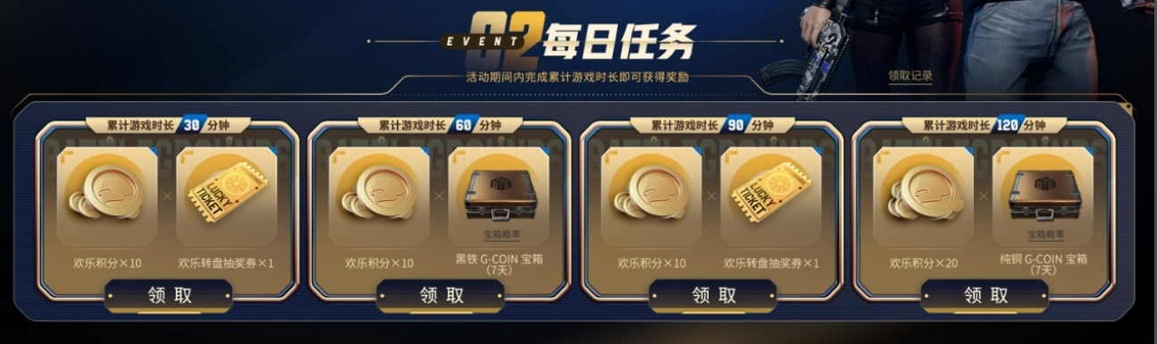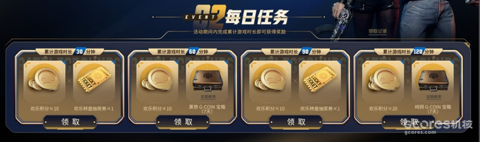 活动2:每日任务,活动期间完成每日任务即可获得欢乐积分及欢乐转盘抽奖券,完成60分钟和120分钟时长任务还可以获得G-Coin宝箱(7天)!