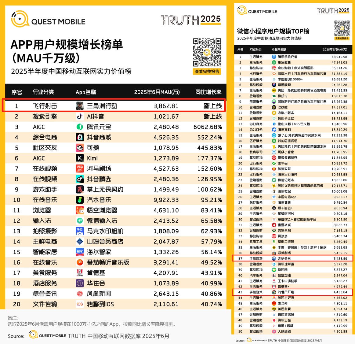 2025中国移动互联网半年大报告:月活前十仅《三角洲》一款新游、千万级小游戏数量反超手游 | 游戏观点 | 游戏报道