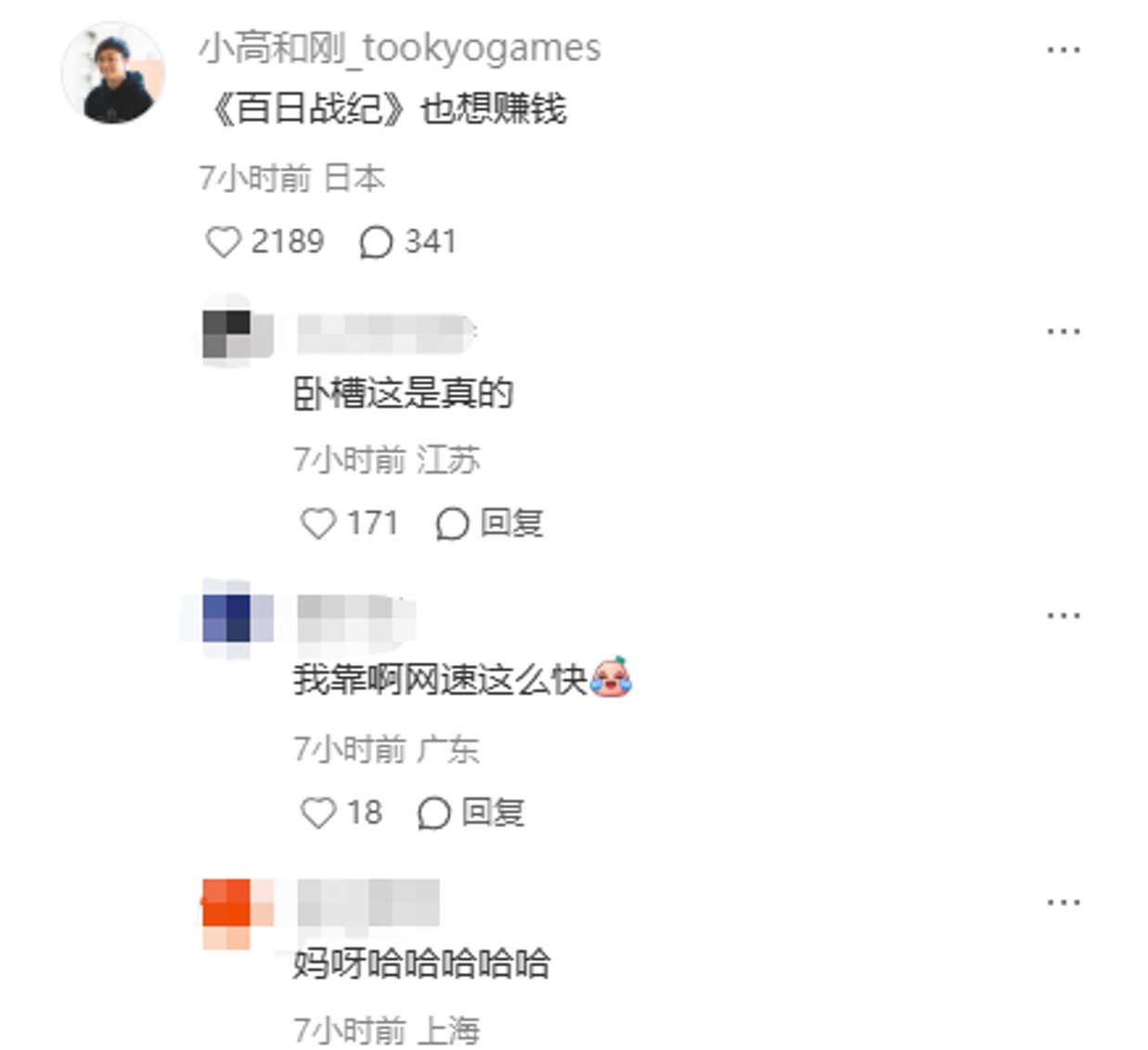 这也导致其它圈子的玩家也开始玩梗,给自己在玩的游戏也P上“XXX想赚钱”的类似公告,有意思的是,前段时间在国内小红书等平台疯狂营业,积极为自己的新游《百日战纪》带货的小高和刚,也在《世界之外》官方的这条评论下面回复,表示“百日战纪也想赚钱”,成功逗笑大伙。