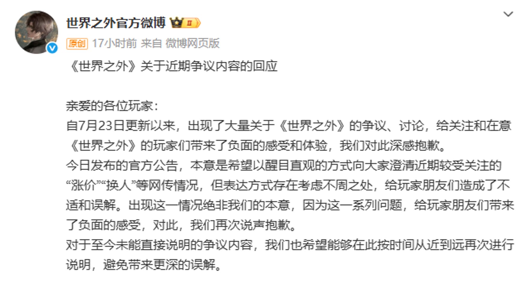 由于这次新卡池涨价没有在事先发布明确的公告,导致玩家并不知情,因此游戏更新当天发现抽卡涨价的玩家自然产生了不满,由此也引发了一些社区舆论。而昨天(7月29日),《世界之外》官方也对上周的卡池涨价事件,以及近期其它的一些社区争议事件,包括外界对项目组变动的猜测进行了回应。