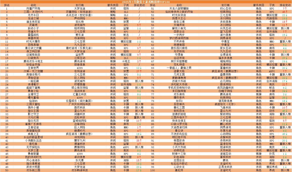 游戏新闻报道/微信小游戏榜单越来越有趣了。在头部榜单不断固化的同时,入榜新游戏的数量却连续数月保持在20款以上。7月份的微信小游戏畅销榜单前十名中,7个位置保持不变,Top 30却有3款新游戏入榜,Top 50与上月一样,有9款新入榜或重新入榜产品。
