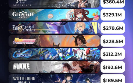 二次元手游“ 全球TOP10 年收入榜”:米哈游星铁夺冠,叠纸亚军、库洛第8!